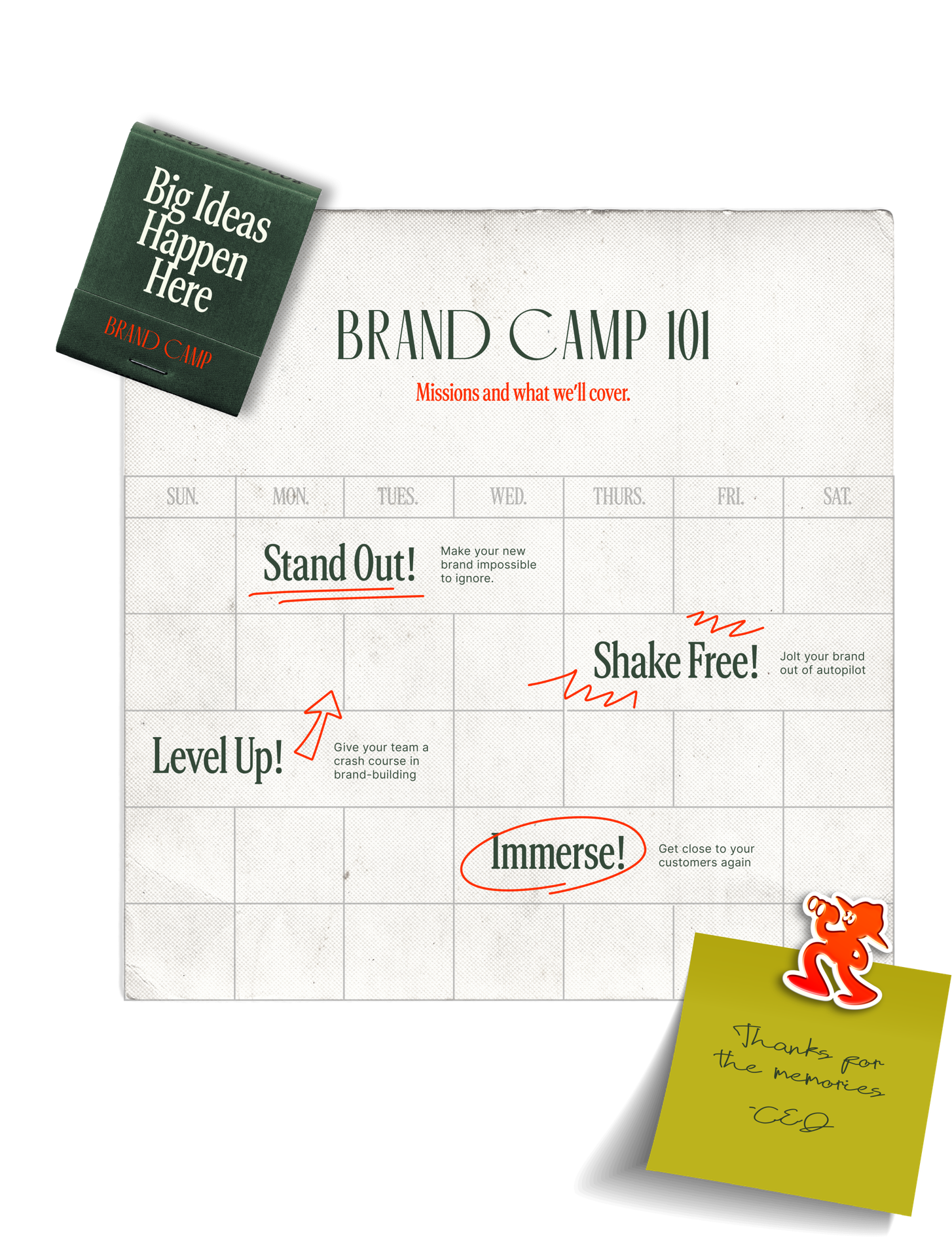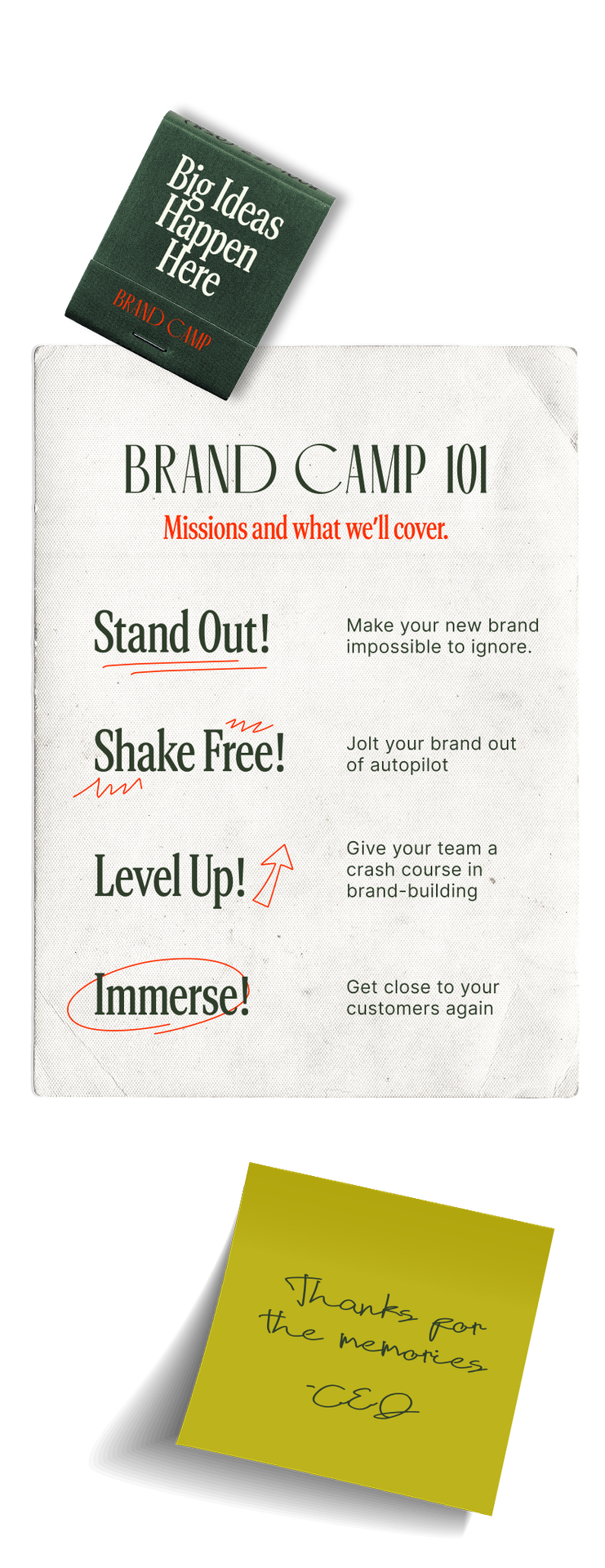 Brand Camp is a guided brand experience for CEOs, CMOs, founders, and the small teams responsible for shaping what’s next for their business. It’s part strategic workshop, part retreat, designed to help leaders step away from the day-to-day and focus on the bigger picture.